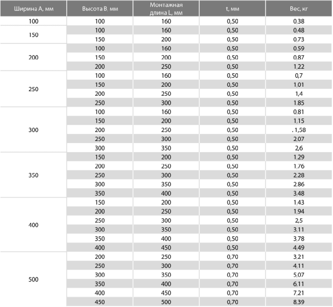 Размеры и технические характеристики дроссель клапанов прямоугольного сечения