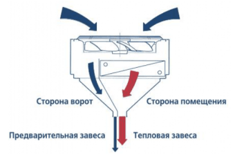 - Предварительная завеса служит «опорой» для тепловой завесы, благодаря этому нагретый воздух не выходит из помещения.