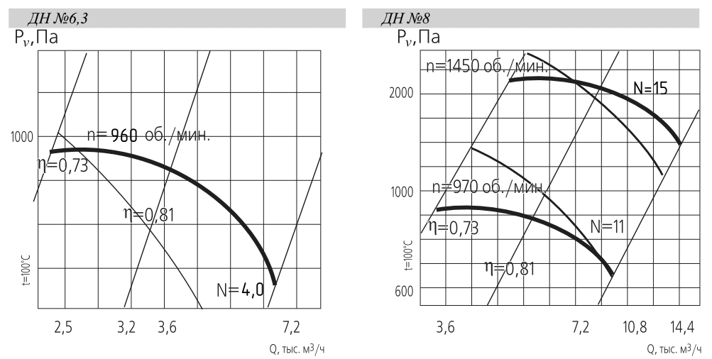 Дымососы Д и ДН применяются для удаления продуктов сгорания от котлов в дымовые трубы. Температура перемещаемых газов не выше 200 С° (из углеродистой стали) и 400 С° (из нержавеющей стали). Производительность – 2320-4250 м³/час, давление – 415-2120 Па в зависимости от выбранного двигателя.
