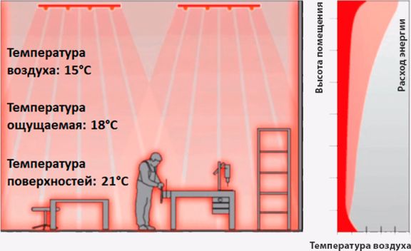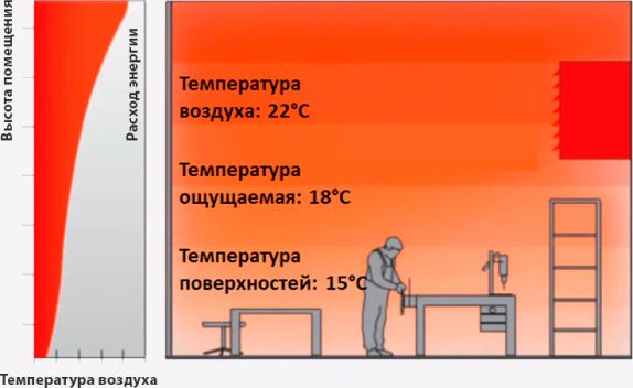 - В отличие от воздушно-отопительных приборов, панели нагревают все твёрдые тела, находящиеся под излучением. Воздух в обогреваемых помещениях, оставаясь практически прозрачным для инфракрасного излучения, нагревается за счет вторичного тепла, т.е. конвекции от конструкций и предметов, нагретых излучением. Благодаря этому принципу, под потолком перегретый воздух не скапливается, а в помещении наиболее приятный микроклимат. Расположенная ниже илюстрация позволит сравнить работу традиционных воздушно отопительных приборов и инфракрасных водяных лучистых панелей.