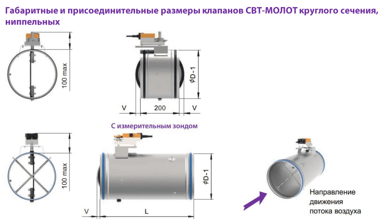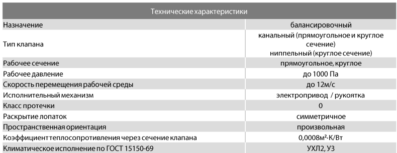 Клапаны изготавливаются круглого и прямоугольного сечения из оцинкованной (исполнение Н) или нержавеющей (исполнение К) стали. Клапаны круглого сечения состоят из корпуса и всегда одной лопатки поворотного типа, прямоугольного —из корпуса и лопаток поворотного типа с симметричным раскрытием. Клапан с измерительным зондом позволяет измерять фактический расход воздуха, проходящего через клапан, для возможности произвести более тонкую балансировку сети. В качестве исполнительного механизма применяется, как правило, ручной привод в виде специальной рукоятки с возможностью ее фиксации в заданном положении, и площадки, с нанесенной на нее маркировкой угла открытия лопатки. Однако если доступ к клапану затруднен и нет возможности отрегулировать его вручную, следует применять электроприводы плавного регулирования с дистанционным управлением.