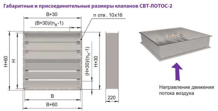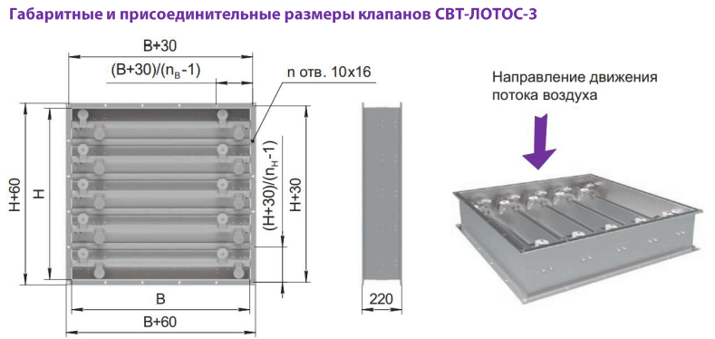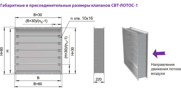 Клапаны серии ЛОТОС состоят из коробчатого корпуса и профилированных лопаток, установленных в корпусе на осях и выполненных из стали. Примыкание лопаток клапанов СВТ-ЛОТОС — замковое. Вылет лопаток за габарит корпуса отсутствует. Материал изготовления — оцинкованная (H) или нержавеющая (исполнение К) сталь.