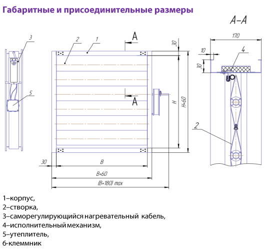 Клапан состоит из коробчатого корпуса, выполненного из оцинкованной (исполнение Н, Ц) или нержавеющей (исполнение К) стали. Лопатка клапана выполнена из усиленного алюминиевого профиля (исполнение Н, К) или стального оцинкованного профиля (исполнение Ц). Кинематика такого клапана — рычаги и тяги. Нагревательный кабель, расположенный по периметру клапана, является саморегулирующимся, т.е. имеет безреостатное автоматическое управление, не требующее дополнительной автоматической схемы управления. Нагревательный кабель, снаружи закрыт специальным утепленным кожухом. В случае наружного размещения такого клапана, электропривод размещается в специальном термоизолированном корпусе, защищающем привод от воздействия осадков и температуры. На корпусе клапана размещается клеммная коробка для подключения систем автоматики и сигнализации (степень защиты корпуса IP54)