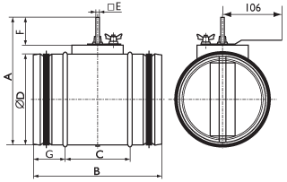 Корпус клапана оснащён резиновыми уплотнениями для подключения воздуховодов или других компонентов вентиляционной системы. Управление воздушными клапанами может осуществляться вручную с помощью рукоятки, которая позволяет зафиксировать заслонку в нужном положении, или с использованием электрического привода. Клапаны сохраняют свою функциональность и могут использоваться независимо от их ориентации в пространстве.