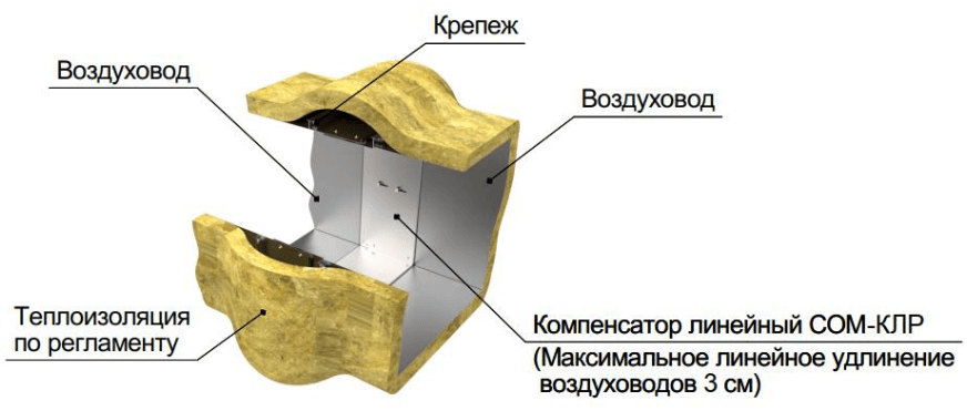 - Конструкция КЛР по-умолчанию может компенсировать линейное удлинение воздуховодов до 30 мм. При необходимости, возможно произвести компенсатор с большим удлинением.