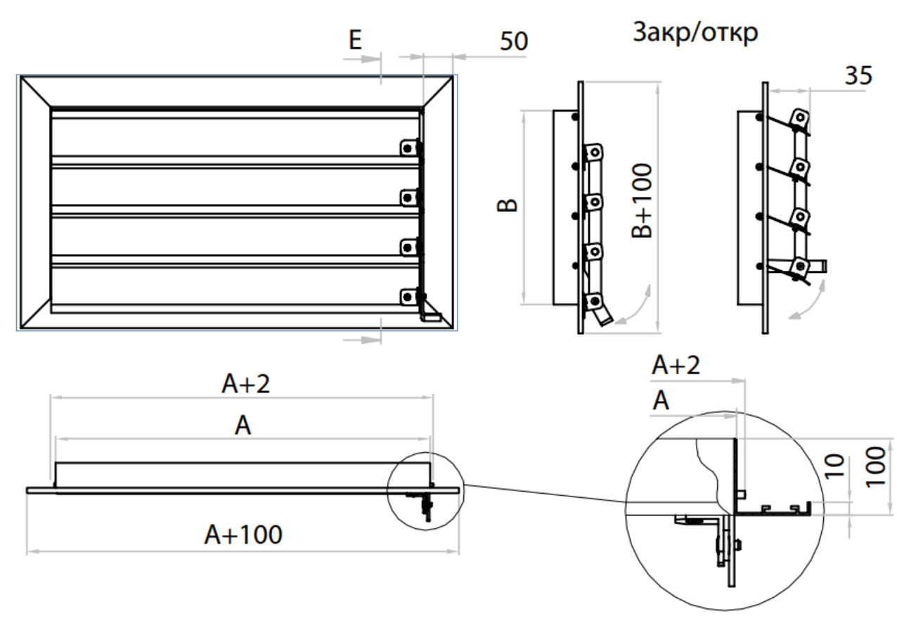 Решетка-клапан выгодно сочетает в себе декоративную функцию решетки, для закрытия вентиляционного канала, и клапана, для частичного или полного отсечения воздушного потока. Управление осуществляется при помощи ручки. Так же может быть изготовлена с электроприводом, для дистанционного управления.