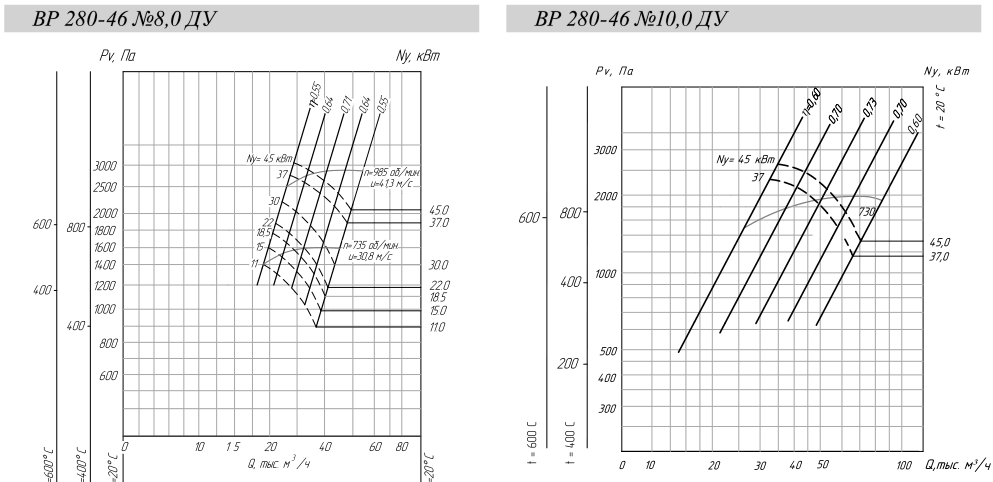 ВР 280-46 ДУ №8,0 – вентилятор дымоудаления одностороннего всасывания, используется для отвода тепла и продуктов горения из жилых, общественных, промышленных зданий. Производительность – 19000-37000 м³/час, давление – 1430-2850 Па в зависимости от выбранного двигателя.