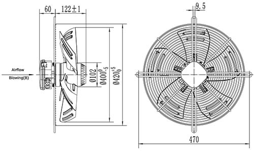 Вентилятор осевой YWF4E-400B-102/47-G нагнетающий на плоской сетке 3700 м3/час