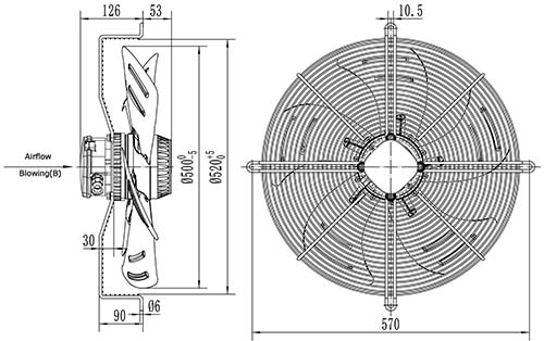 Вентилятор осевой YWF4E-500B-137/35-G нагнетающий на сетке 6800 м3/час