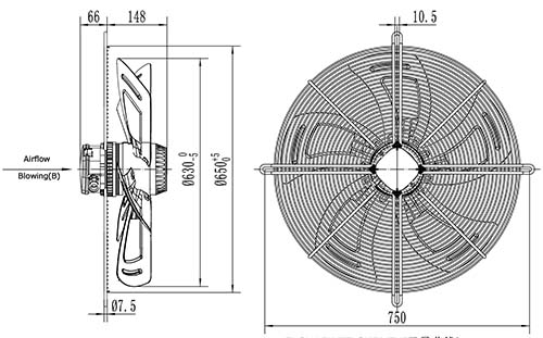 Вентилятор осевой YWF4E-630B-137/70-G нагнетающий на плоской сетке 10500 м3/час