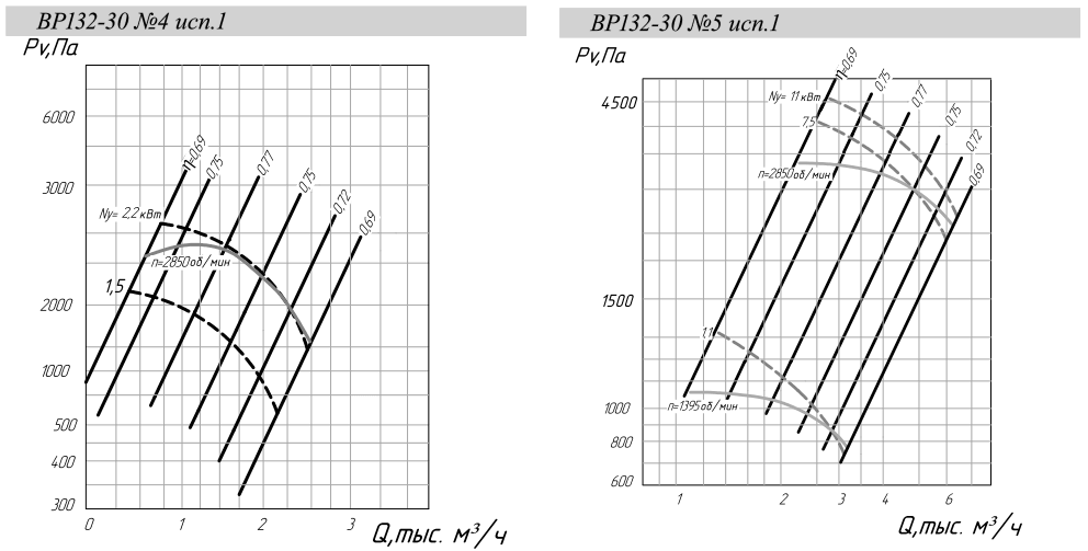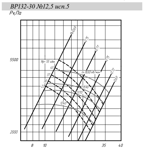 | Типоразмер вентилятора ВР 132-30 | Конструктивное исполнение | Двигатель | Частота вращения рабочего колеса, n-1 | Параметры в рабочей зоне |